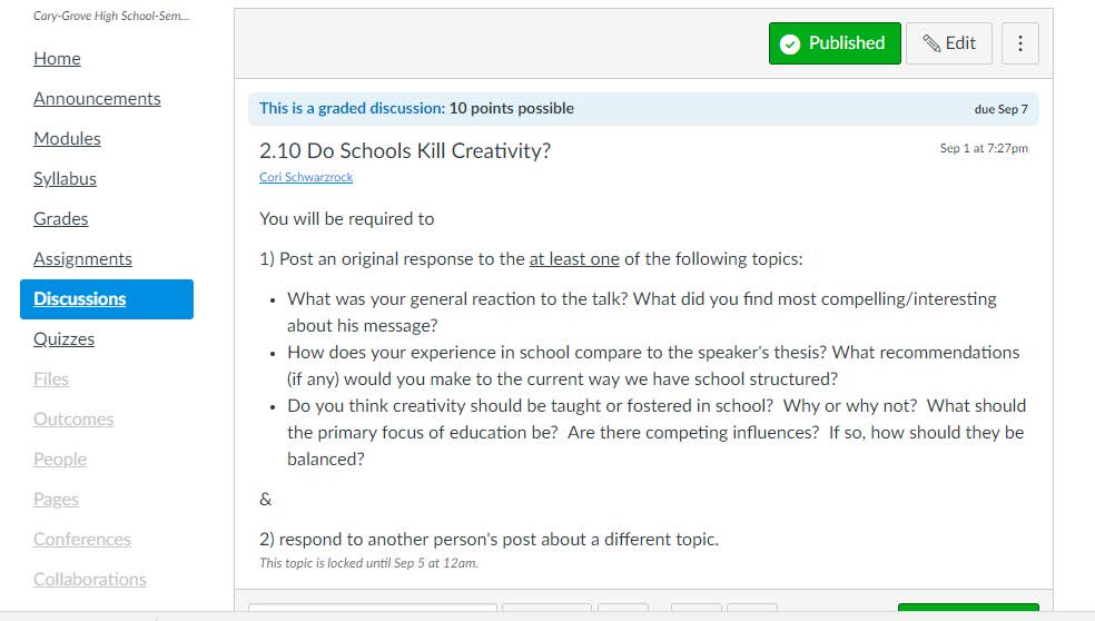 What is one amazing benefit to a blended classroom? The easiest, most accessible sub plans ever! Next week, I will be attending a training on our new LMS, Canvas. According to my pacing calendar, the topic for this day is creativity and problem solving. In the past, this lesson revolved around a lot of in-class discussion; we crafted a definition of creativity, created examples of convergent and divergent thinking and discussed the TED Talk, “Do Schools Kill Creativity?” Now, since I am using a blended methodology, I do not need to lose a day or change my schedule! I just need to change my method of instruction and assessment.