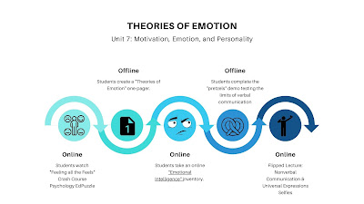 The following station rotation was developed for Unit 7: Motivation, Emotion, and Personality in my AP Psychology class. It covers the content from Topic 7.3 Theories of Emotion. I choose to redesign this section of my unit because my students have struggled with the theories of emotion in the past and many of the activities that I already did would actually work better in a HyFlex environment – with some of my students in the classroom and some at home.